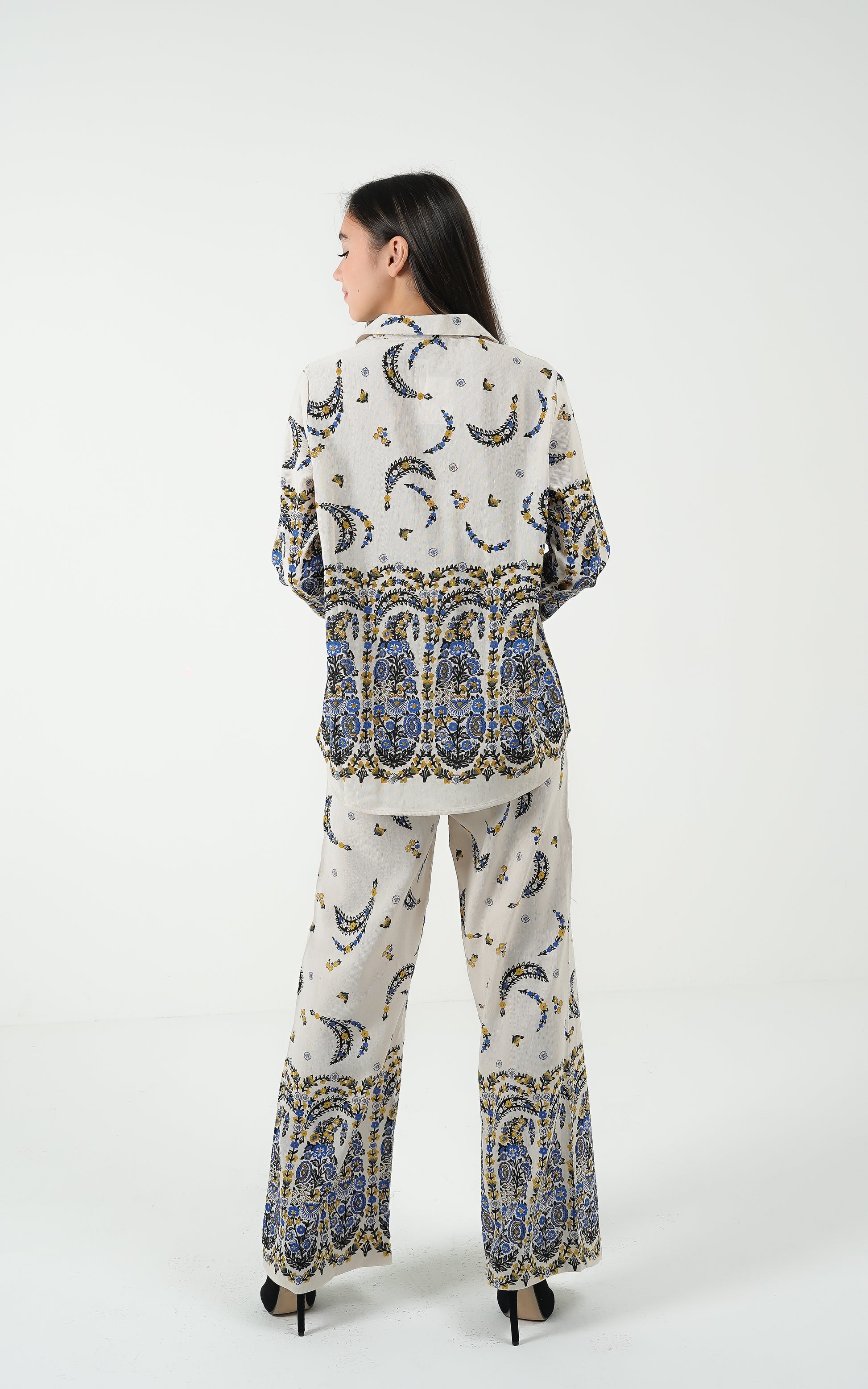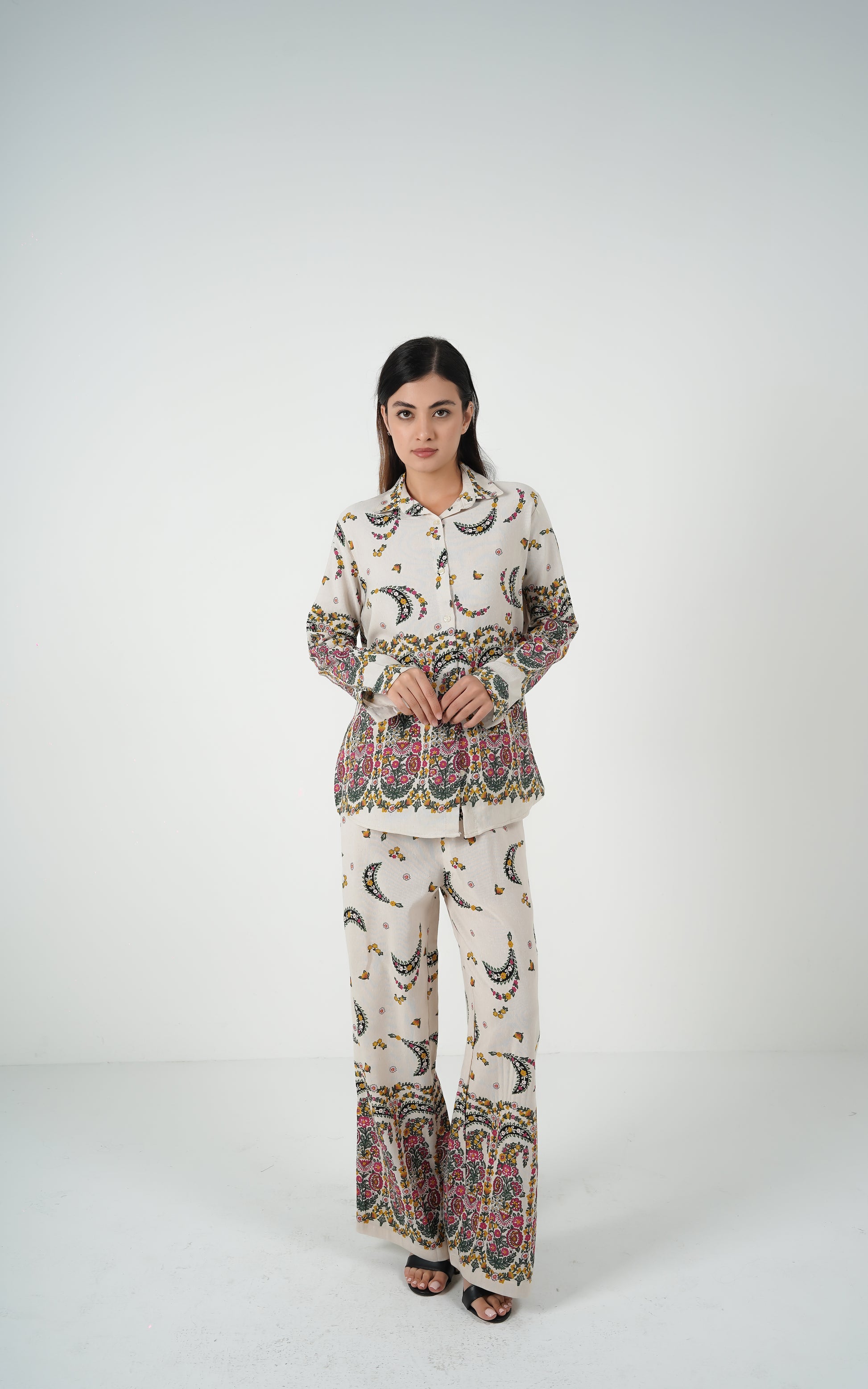 Statement border print on sleeves and trouser hem for added character.