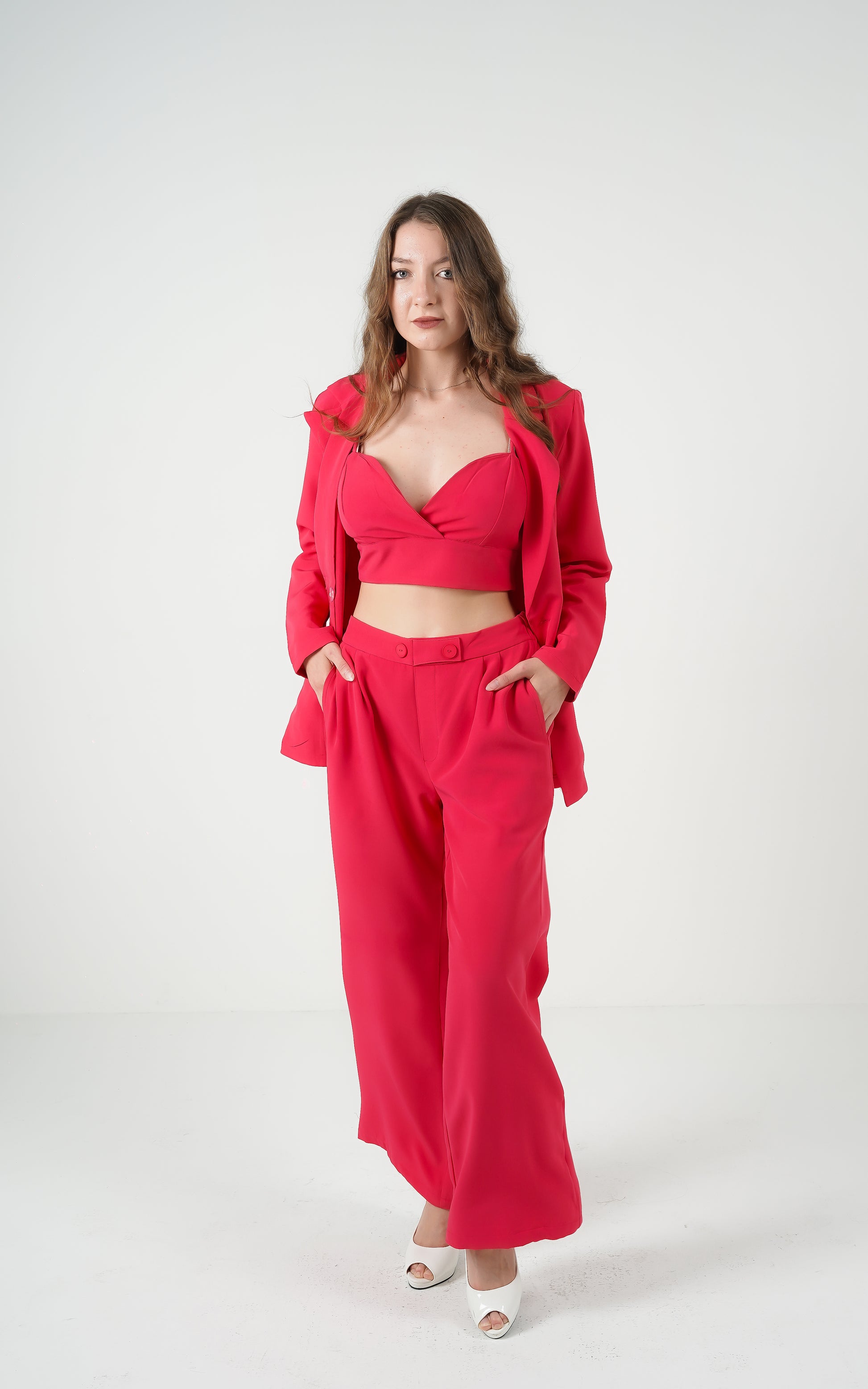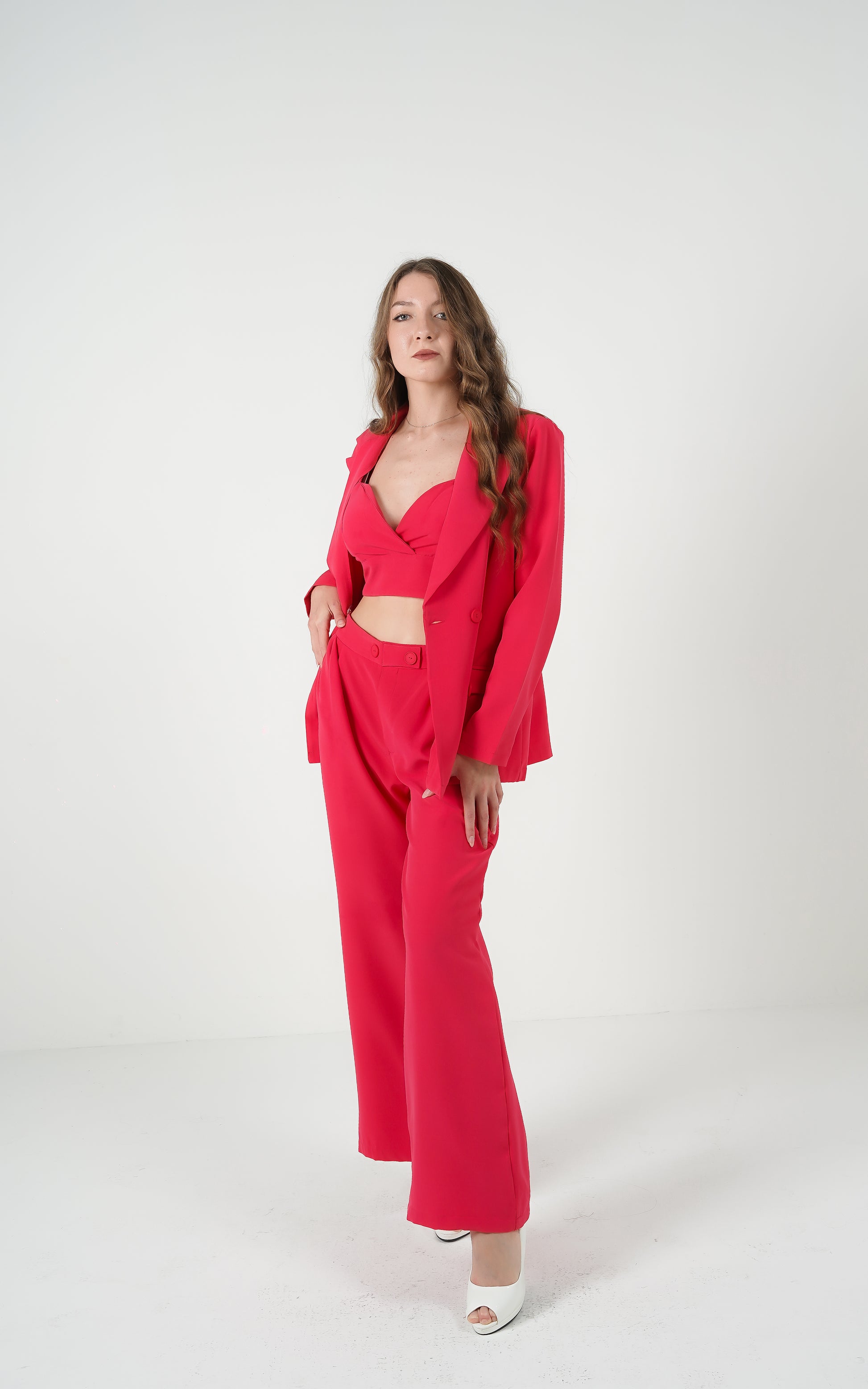 - Designed to complement the structured blazer, adding a touch of boldness